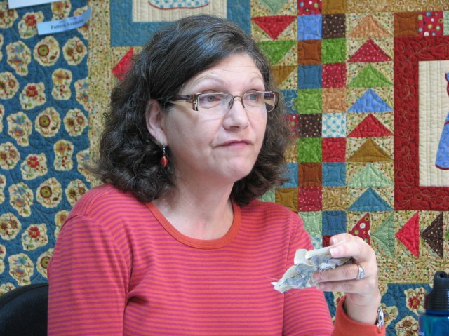 Brenda also pulled out this appliqué block that she’s working on using the back-basting technique.  Then she was required to explain that technique to everyone.  Beautiful block!