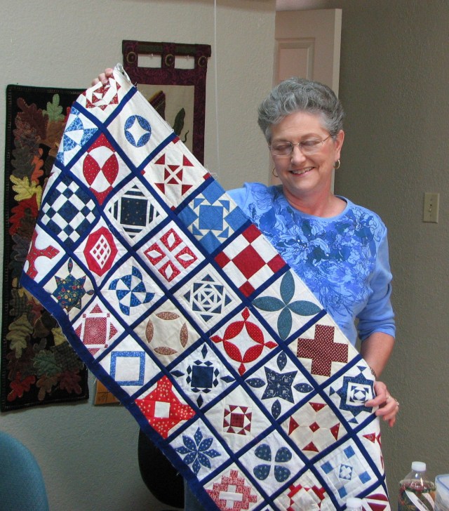 Sherrill is also working on a red, white & blue DJ quilt.  Her first DJ is finished, basted and ready for quilting.  But now she’s stuck.  So she just makes more DJ blocks.  She does have a completed DJ in which she made the blocks bigger – oh, so much bigger.  They are 6″ blocks.  And very cool.