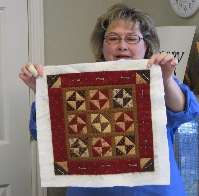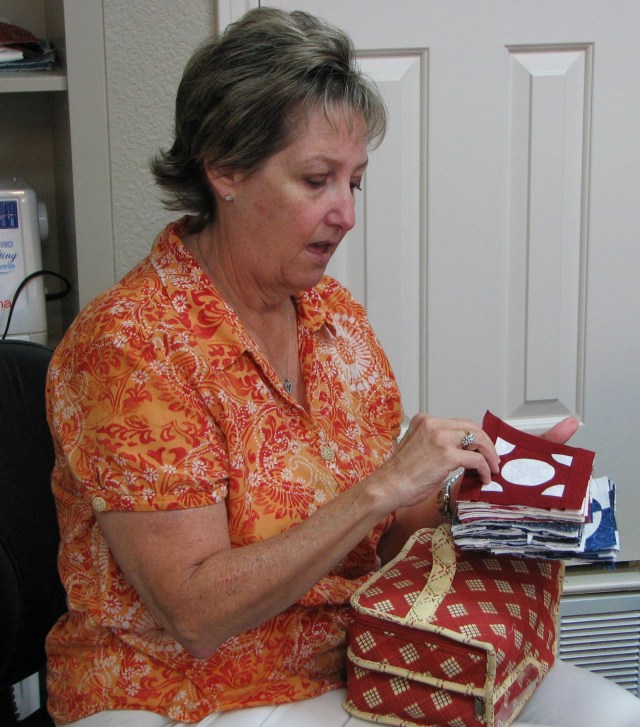 And so you don’t think I’m a total slouch who will never finish her DJ quilt, Sandi grabbed my camera and snapped this picture of me as I was just getting ready to thread my needle.  And I actually sewed 6 or 7 seams before the day was over.  At this rate, I’ll have the quilt done in no time.  Not.