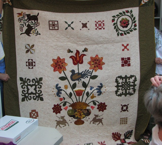 Then we opened up the big suitcase that Brenda brought along and were inspired and motivated some more!  This quilt was made for Brenda by gals on the DJ list.  They decided she was never going to have a DJ quilt of her own unless someone made one for her.  It’s all hand quilted and everything.  And it’s beeeauuuutiful!
