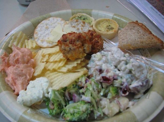 And because I can’t start your day without making you hungry, here’s a picture of my plate of food.  It was all very delish!  And I filled my dessert plate and ate it so fast, I forgot a picture.  Just imagine cinnamon cream cake, brownies and Krispy Kremes alongside Dot’s chocolates.