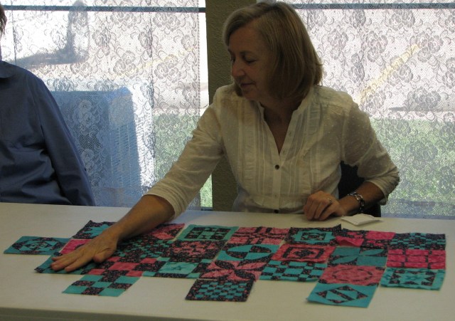 This is Del Jeanne with her cool teal & pink DJ blocks.  She is not a regular in our DJ group.  She came from Arlington to be with us for our party day.  I hope she will join us again sometime.  Want to come and retreat with us in January, Del Jeanne?  I just discovered she could be called DJ like the quilt!