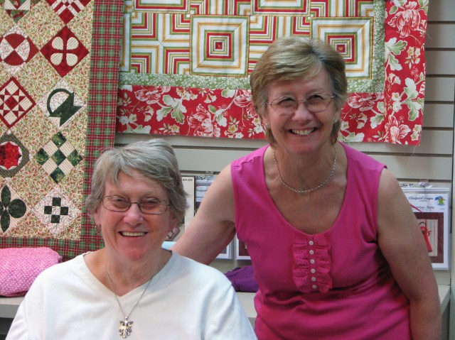 This is Dot from England holding up her Dear Jane book as JoAnne looks on.  Dot was very happy to meet Brenda.  And we were very happy to see Dot again.  I could listen to her talk all day.  This is her 3rd time to visit our DJ group.  And she is a joy to have around.  We want her to move to Texas!  She would love to comply.  Just don’t listen to her talk and then tell her you thought she was from Australia.  She will definitely roll her eyes at you!  Dot brought all her DJ blocks with her in fancy photo albums so the fabric was very protected.  She’s making hers in Christmas fabrics – you can see a green block in JoAnne’s hand.  I can’t wait to see it finished, Dot.  Come and visit us again next year!