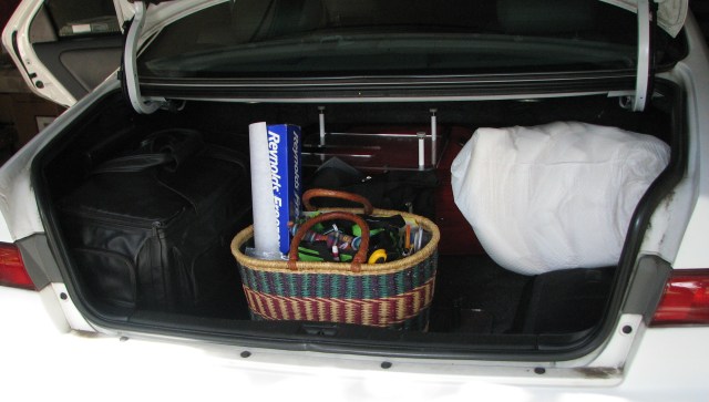 This is my trunk before I picked up Suz. Or maybe I should say before I picked up Suz and Suz’ stuff. As you can see, I really wondered where her stuff was going to go. It appears there is not a lot of room left for her things. Unless she wanted to give up her front seat and be a hood ornament on the way. So that her stuff could come along.