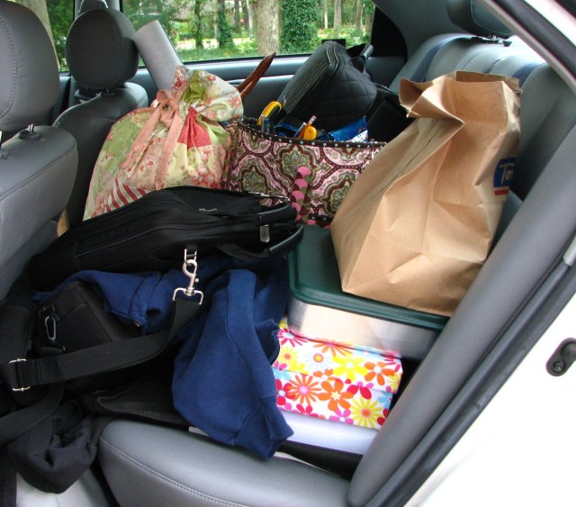 For those of you who have never been on a quilting retreat, I thought it might be important for you to see what our packing looks like. The important things that it’s necessary to bring along. And the size of the piles of stuff. Cars have never been so weighted down.