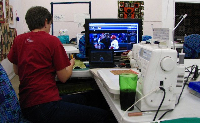 Here’s my friend, Suz, sitting next to me in the retreat sewing room. And you can see on the screen why it was important for us to have a TV along. Wouldn’t you know that the timing would be such that our dear Rangers would be playing all three days of our retreat! And we have to watch! And cheer! And wear our new Rangers’ shirts! GO RANGERS! Because after all Suz and I are fanatics.