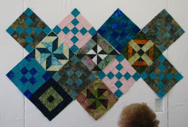 This is Jules’ quilt and an example of how design walls can change in the blink of an eye.  I turned my back for 43 seconds and the wall looked like this: