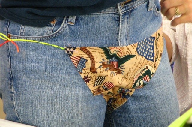 And that might be because one retreater forgot a very necessary item of clothing when she packed her things for the week.  A particularly sensitive, needed article of clothing.  So one of the other retreaters stitched a replacement for her.  Way to go retreaters!  These gals are so resourceful.  It’s unbelievable.  Really it is.  You’re going to love these next pictures.