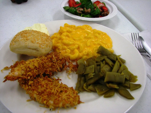 Here’s how it looked at dinner last night. With homemade macaroni and cheese and yummy green beans. And the best strawberry spinach salad you ever tasted.
