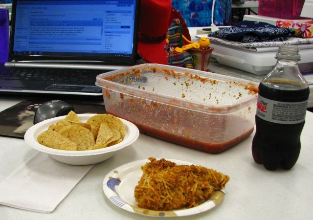Pat made some really yummy homemade salsa. And forgot to take it with her when she left. Or maybe she just knew I’d need it tonight. Thanks, Pat! It’s the best! And leftover chicken from dinner tonight. With some fancy-schmancy cornflake breading that is out of this world. And it’s even better cold out of the fridge at midnight (or 2:30 a.m.) than it is at dinner. If that’s possible. Wish you were here to share it with me.
