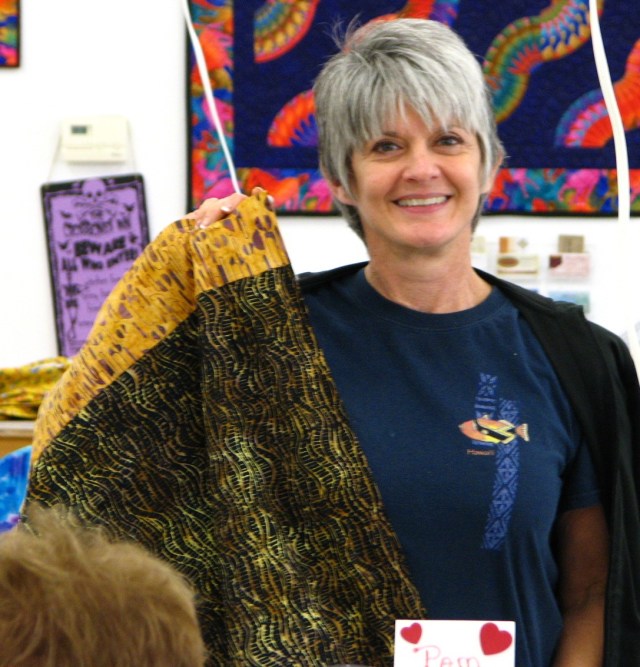 This picture has absolutely nothing to do with Secret Sisters. In fact, it is Sue showing her aprons in our Show ‘n Tell time. So I guess you could say that it’s a teaser for the Show ‘n Tell pics to come on the blog. But I really included it to show you this: