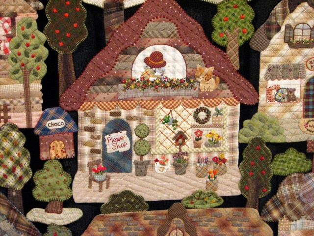 These cute little houses are in a category that I always love to see. “Handmade” which means that the entire quilt must be made by hand. But you need to see one of the little houses up close.