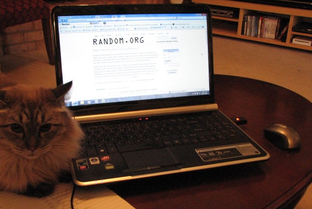 Can’t I just point to the winners?  On this piece of paper where you wrote all the names in order so you’d know their numbers?  How about this one right here?  She’d like to be a winner.  I’m just sure of it.  No, Miss Kitty.  You have to click the mouse!  We want a fair draw here.  Get over there and click on the mouse!  That’s her “stop bothering me” look, by the way.