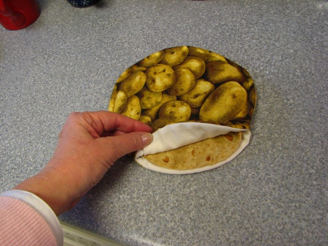 Some things to keep in mind.  Use only cotton materials for the entire bag.  That includes the fabric, the batting and the thread.  Polyester might melt or catch fire in the microwave.  And fires in the microwave just might ruin your day.  Melting will certainly ruin your potato.  Just sayin’.