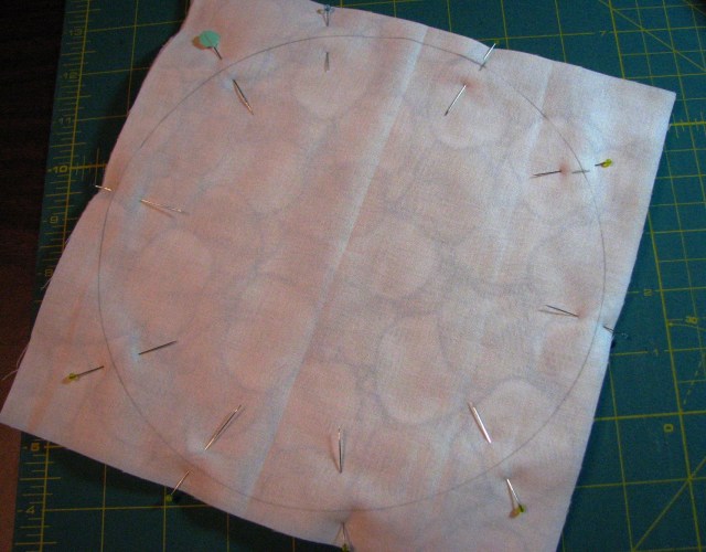 Layer as follows:  100% cotton batting square, fun fabric square right side up (I used this potato chip fabric too), then muslin with the drawn circle up.