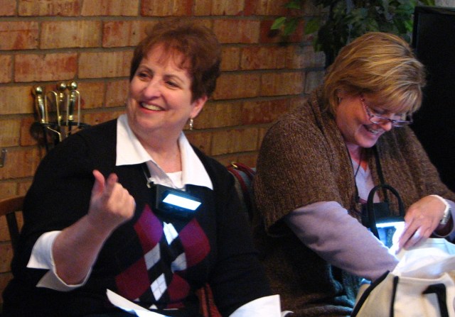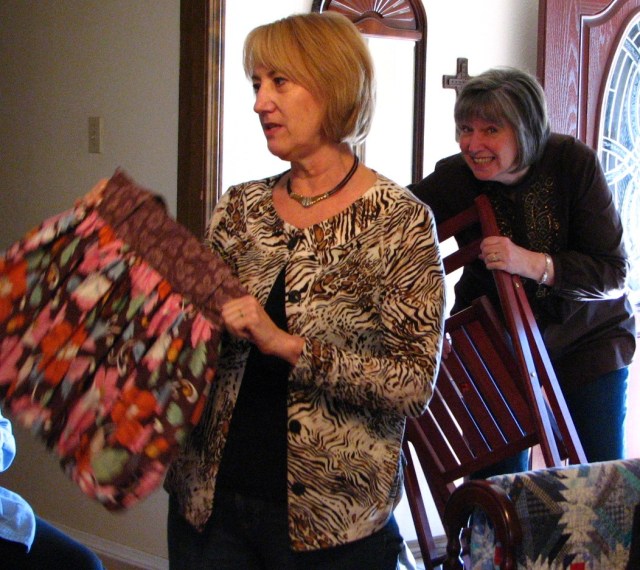 These gals were enjoying the Show ‘n Tell from the other side of the room. And probably trying to sneak a peak inside those brown bags behind Karen.