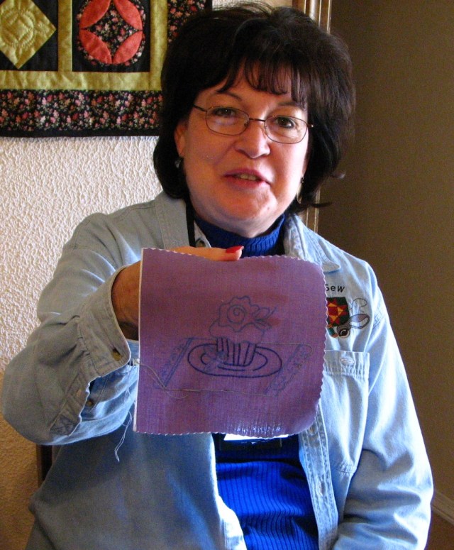 Maggie is brand new to quilting and the JSS group, but look at this fabulous appliqué she’s doing! That’s because she was taught by the best. That would be Susan.
