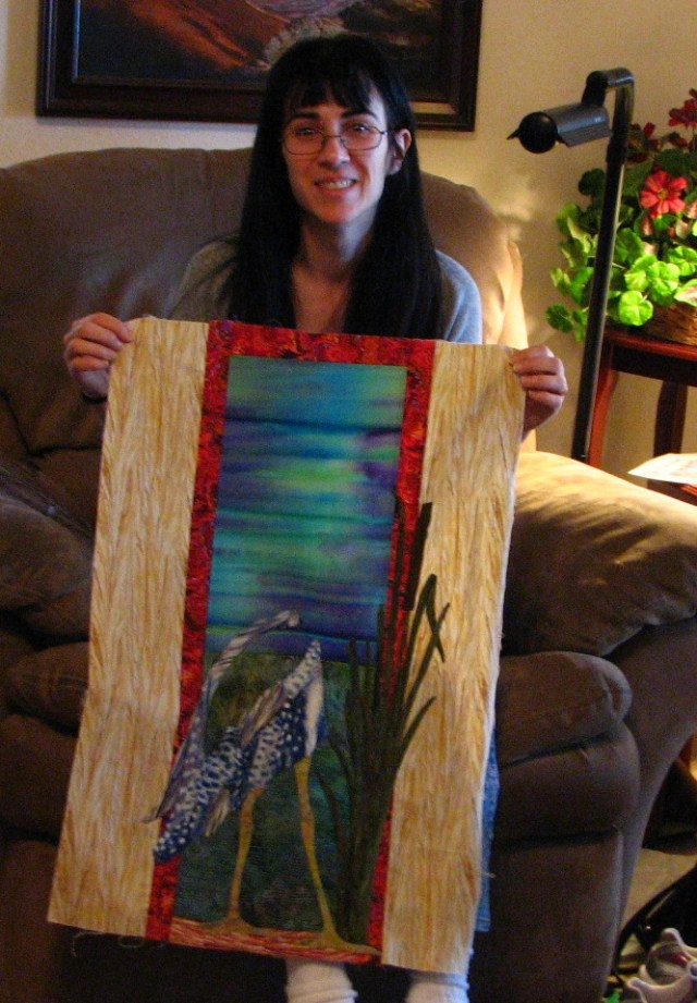 And this fabulous wall hanging belongs to Suz. She had it quilted by Susan Corbett and brought it to show. But it was pieced and appliquéd by Judy R. That’s because Suz was the lucky recipient of this top in our Brown Bag Challenge 2010. These gals do amazing work.