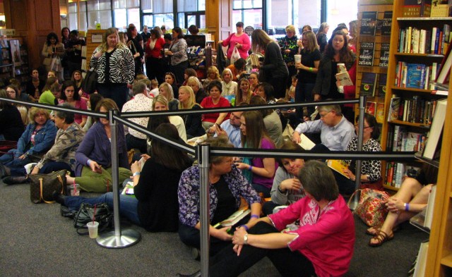 Happy Birthday, Suz!  Isn’t she cute?  She’s standing in line at the Borders Bookstore about an hour before the store opened.  We got there early so we could be sure to get a good spot when it came time for the actual signing.  She was scheduled to pick me up at 8-ish.  I informed her when she got to my house at 7:55 that “ish” means after in my dictionary.    So Boo entertained her for a few minutes before we set off to sit in traffic.  Because we were headed to Big D where traffic is the norm.