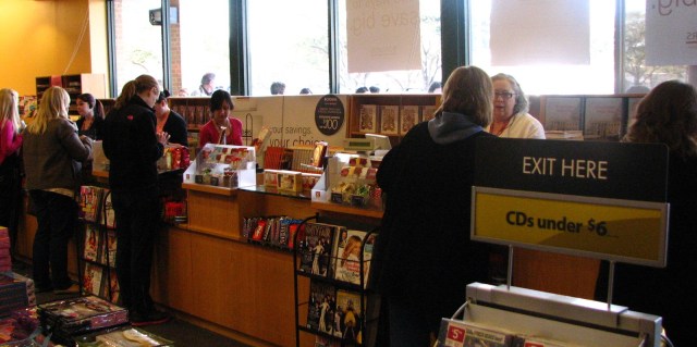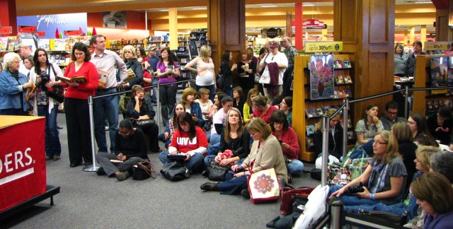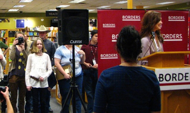 See?  There she is.  Right behind that pillar.  And the line grew behind us as we waited for the Borders people to open the doors.