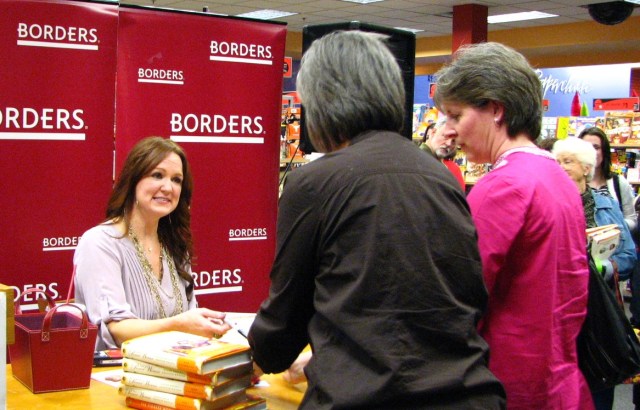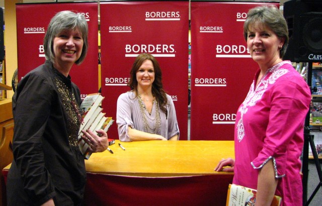 Here we are visiting with Ree.  The nice people at Borders took our cameras and took pics for us while she was signing our books.  Don’t ask me what we talked about.  I have no idea.  I couldn’t remember five minutes after we walked away.  I stammered something silly about us being quilters (I thankfully remembered to leave out the stalker word) as I handed her the fabric flower.  She said something about wanting to check out the flower.  I told her it was Suz’ birthday and Suz thanked her for sharing Valentine’s Day with us and hoped she got to do something fun with her family.  And I think she told us they went ice skating at The Galleria.