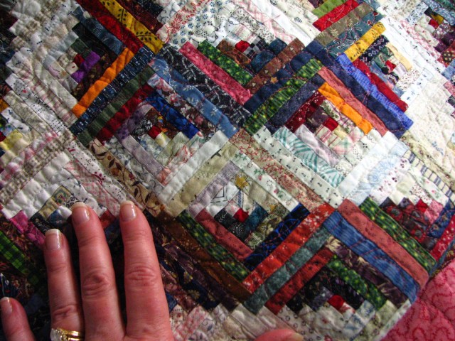 I had to put my hand in one pic.  Just so you could see how small those strips in the log cabin blocks were.  Tiny!  Now you can scroll back up to see the whole quilt again.  Remembering how tiny the strips are.  Go ahead.  I’ll wait.  Scroll up.  Actually, I’ll use this time to go cut my entire stash into .75″ strips so I can make one of these too.  But if I cut up my whole stash, I think I’d be able to make about 457 of these quilts.  Don’t tell Dear Hubby.  He thinks I only have enough fabric for 217 quilts.