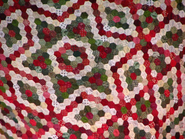 Hi, I love her quilts also. A special thanks for posting the pictures as I am working on one that is her nine patch split, it is like the one with the red triangles set on the diagnol. On her website she has that quilt with it done in a different design. My first quilt was a grandmother’s flower garden I did by hand after my mother died. I do not have it quilted but the top was done in about six months. It really went fast as it is all whip stitiching. So, I wish you luck on doing a hexagon one. My second was a paper pieced double wedding ring wich is almost all sewen together. And I work on a dresden plate one. I love to hand sew. Anyway, I keep coming back to Bonnie’s work because I like her traditional colors and designs and the way she tries new patterns with old blocks. Once again, thanks for posting the pictues.. Rita Hawes of Kasson Mn.