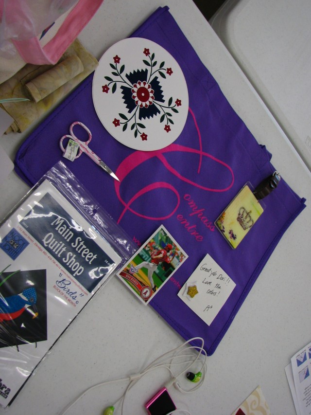 Patti hit the SS jackpot with this wonderful stash of fun things. One gift even had her name spelled out in cool letters! How did she do that when we didn’t even know who we’d have before we got here? These gals are too prepared. And yes, I realize the magazine is upside down in the picture. But I’m sure you can figure out what it is. Or you can stand on your head or turn your computer upside down. Unless it’s an iPad which would then turn the picture over. How does it know?