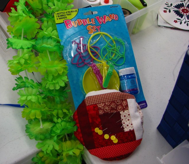 These are Karen’s SS things. A pin cushion, a floral necklace and some cool bubble wands. Which we absolutely must try out tomorrow. Don’t forget Karen! I’m hoping for pics of bee-shaped bubbles. Which could be just a bit too much to hope for.