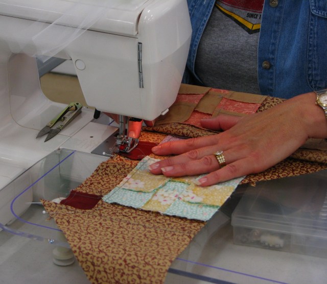 You’ll remember that yesterday’s blog left poor Sally with log cabin blocks hiding all over the retreat sewing room. Well, the day began with Sally finding and retrieving as many blocks as she could.
