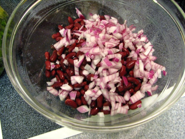Chop up a red onion and add it to the bowl. It’s looking good already to me.