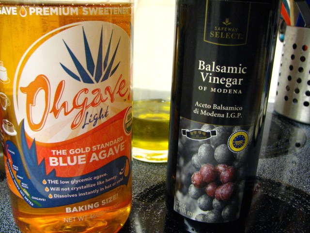 The dressing is made with these yummy ingredients and is probably what makes the salad so good. 3 Tbsp balsamic vinegar (yum), 2 Tbsp olive oil (more yum), and 2 tsp agave nectar (yum, yum, yum) – I just dumped them on top of the other ingredients in the bowl and stirred everything together.