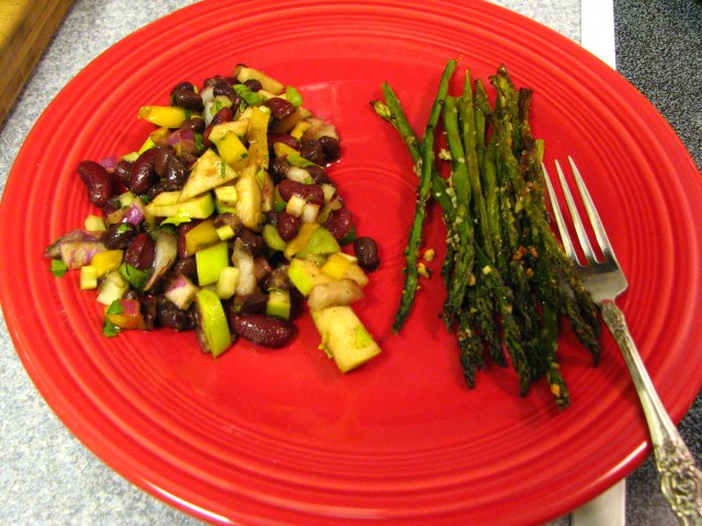 So this was dinner the other night. Roasted asparagus with garlic (also very yummy) and Crunchy Bean Salad. I had seconds on the salad. OK, thirds. And the next day we ate it again and Dear Hubby declared it even better after it sat in the fridge overnight.