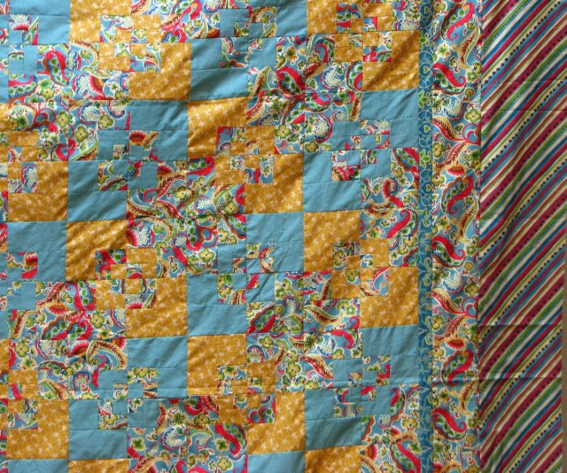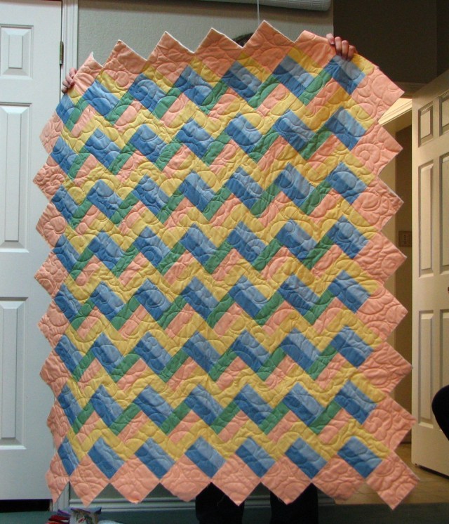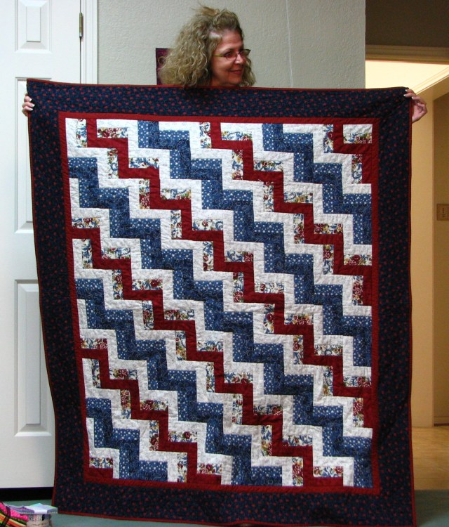 Here’s another simple pattern. A triple rail fence quilt shown by Susan. Cute!