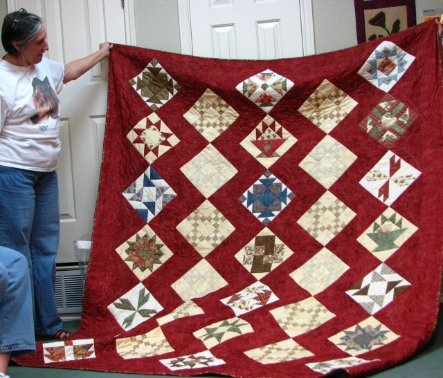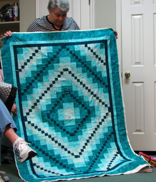 This is the back of Beverly’s log cabin. You can’t really see it but she quilted straight lines in the ditch because she didn’t want to cross any seams in her quilting. And she made it clear that she was showing her quilts first so no one would be embarrassed to show theirs.