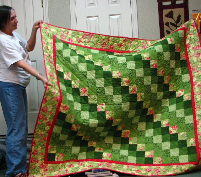 This quilt is a Magic Nine Patch. The pattern was created by Beverly. She is a math genius. Very simple and quick to make and is our go-to quilt when we need to make one in a hurry. Strip pieced with wonderful pressing instructions too. If you don’t have this pattern, you absolutely need it in your pattern stash.