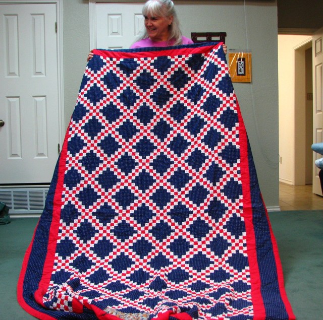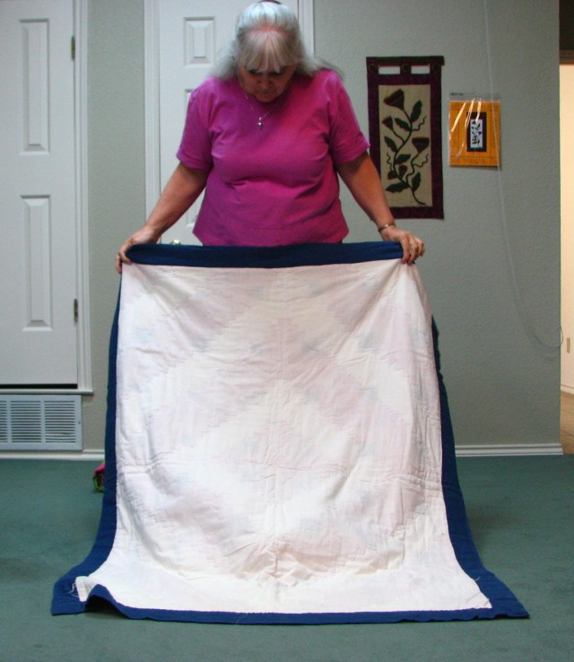 By the way, that nice wide blue border? That’s the binding. Apparently she hadn’t been taught that it was supposed to be about 1/4″ wide. And no, it is not full of batting to the edge. Judges would not give this quilt really high scores. But it has been loved and used by one of her sons for many years.