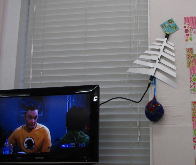 Which could be related to the way we were getting our signal? Do you like our crazy Christmas tree antennae? We even adorned it with a quilt block star at the top in hopes of making it better.