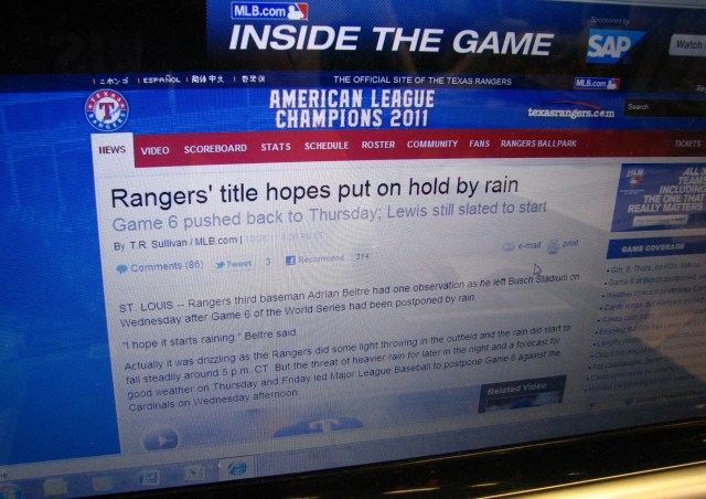 We are on our way to Marty’s parents to watch the game. I am very torn about who to root for, because I lived in Missouri for over 5 years and our Pastor is a huge Cardinals fan. I like Texas and so I will be loyal and support you in your extremely nervous condition, GO RANGERS!!!! It’s been a great series, good for baseball.