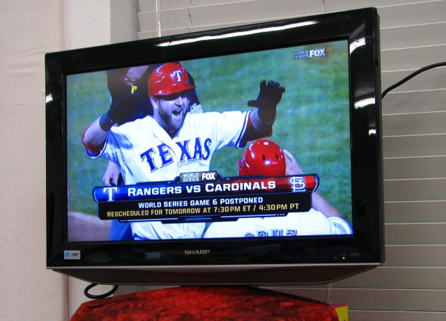 Which actually was a good thing at retreat. We all got more sewing done! But because I wasn’t quite sure I should believe the 643 news stories I read or even the texts that other retreaters received about the rain delay, I turned on the TV at game time on Wednesday. Only to be greeted by this: