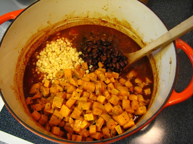 Add in the sweet potatoes, black beans and corn.  Provided you didn’t eat all the yummy sweet potatoes as they sat on the counter awaiting their dip in the sauce.  Stir it all together and heat through.