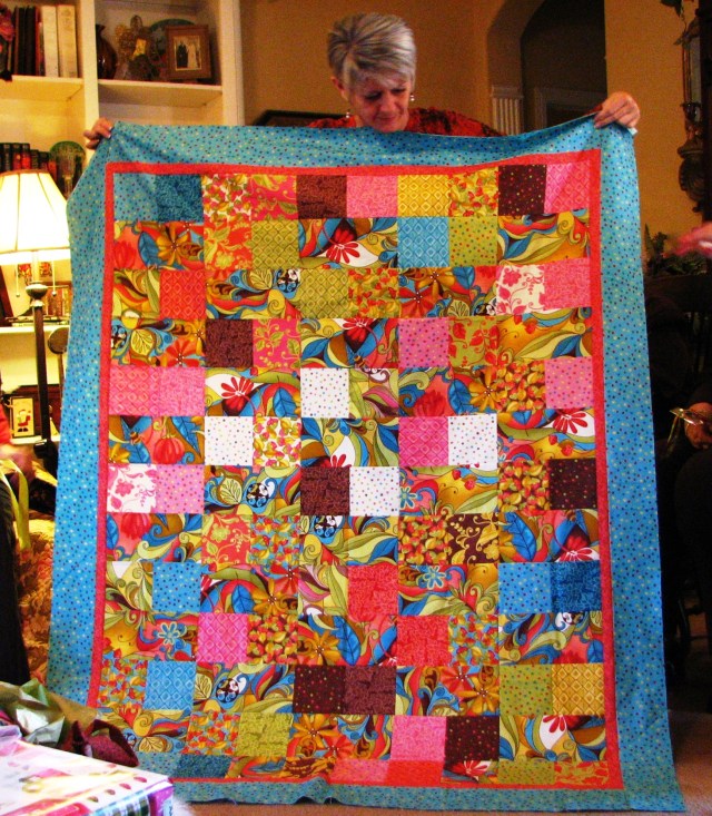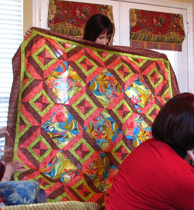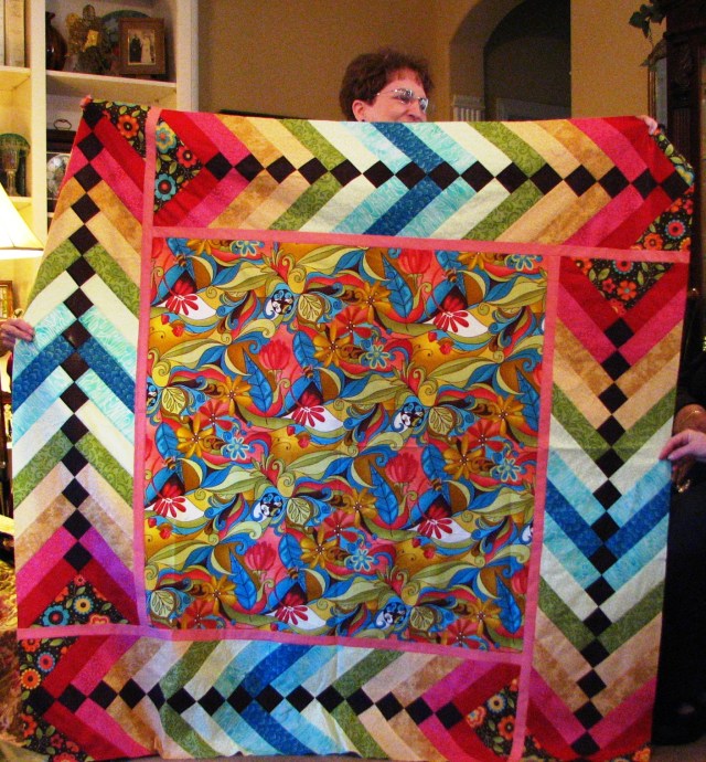 Davene couldn’t bring herself to cut up the fabulous fabric. So she just added gorgeous borders to a large piece in the center. Great job, Davene!