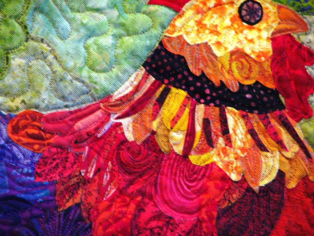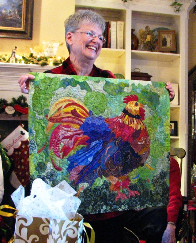 Peggy fooled us all. She hid the fabric in this fabulous rooster. It even hung in our quilt show in September! And she got a fabulous third place ribbon too.