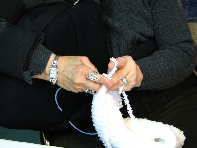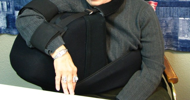 Poor Lynda! She brought a pillow along with her. Or maybe we could say it’s a very large pin cushion. But she had to permanently hold it under her right arm! That’s what happens after rotator cuff surgery. She has to endure 6 weeks of that big pillow under her arm.