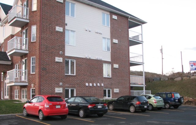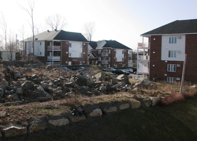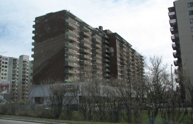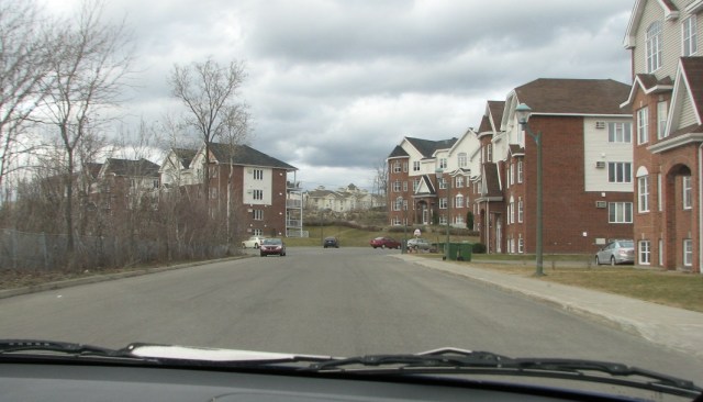 This is the road leading to Hubby’s apartment.  This drive actually dead ends in his parking lot.  He has a reserved spot!  His building is behind the one at the end on the left.  Kind of hiding behind the bare trees.  Did I mention that it is not yet Spring in Montreal?  My friends in Texas will love that.  Considering it’s probably 85° there today.