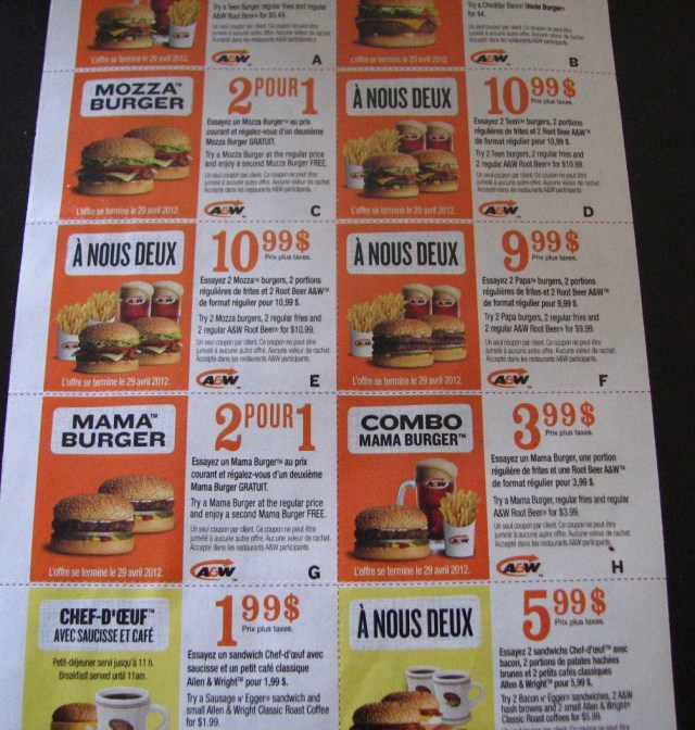 This came in the mail the other day.  Wanna go to A&W for lunch with a coupon?  At least some of the big print is in English and there are pictures.  Does that mean that Mama Burger doesn’t translate to French?