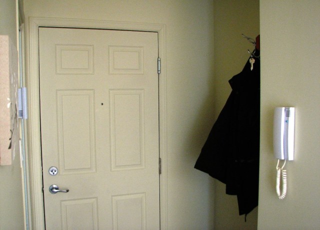 The entryway inside the apartment.   That’s my big, warm parka hanging on a hook by the keys.  It’s still in the 30’s at night here!  The phone is the doorbell.  The building itself requires a key to enter.  There is an intercom system for visitors.  You punch the button to let them in when they call.  Dear Hubby leaves me the keys in case I want to get out each day so he has to use the intercom to get in after work.  Sometimes I let him in on the first call.  And sometimes we play the “who i-i-i-is it?” game.  Sometimes he even laughs.  Mostly he says, “let me in!”