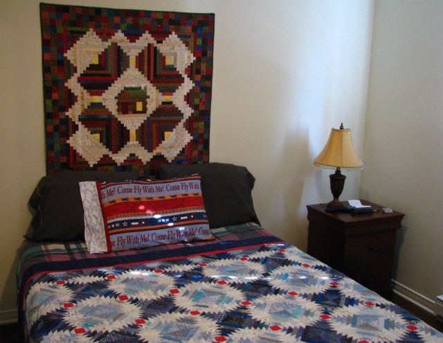 The bedroom.  And yes, I made room in my luggage to bring up that quilt hanging on the wall.  Because I was tired of the blank white wall behind hubby’s head when we talked on Skype with him sitting on the bed.  Now I can enjoy my handiwork behind him.  Nice.
