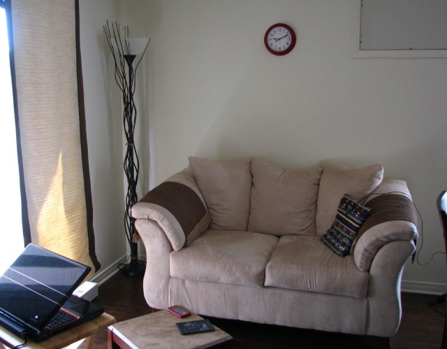 The living room.  Sliding glass doors to the patio on the left.  Functional little red clock on the wall.  My Kindle and smartphone on the little table.  Hubby’s laptop.  No TV.  You heard me…. no TV.