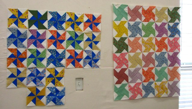 On Monday this wall of Sue’s looked like this.  Very cute pinwheel quilts.